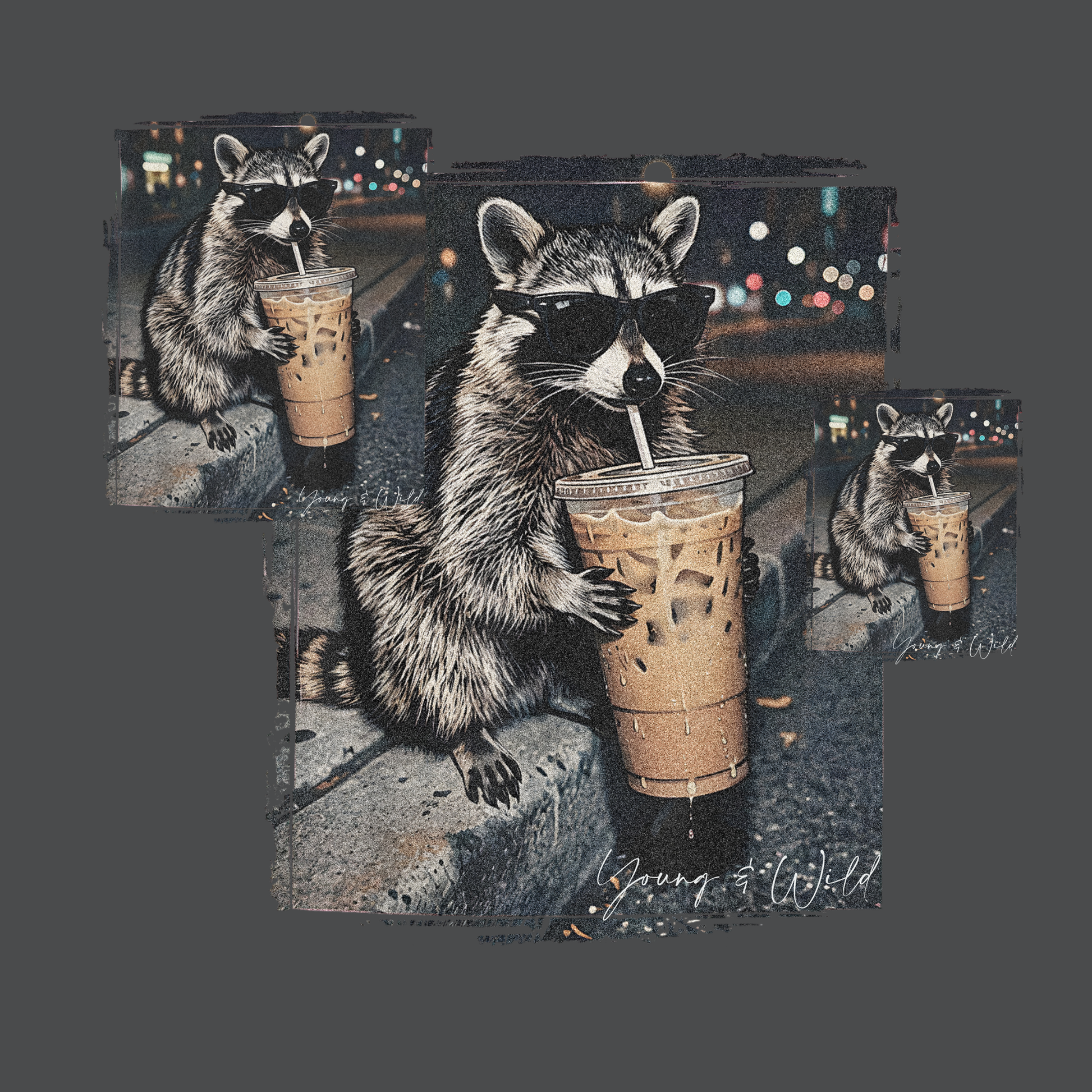 This laid-back design features a too-cool raccoon rocking shades and sipping iced coffee under city lights — because caffeine and a little chaos go hand in hand.